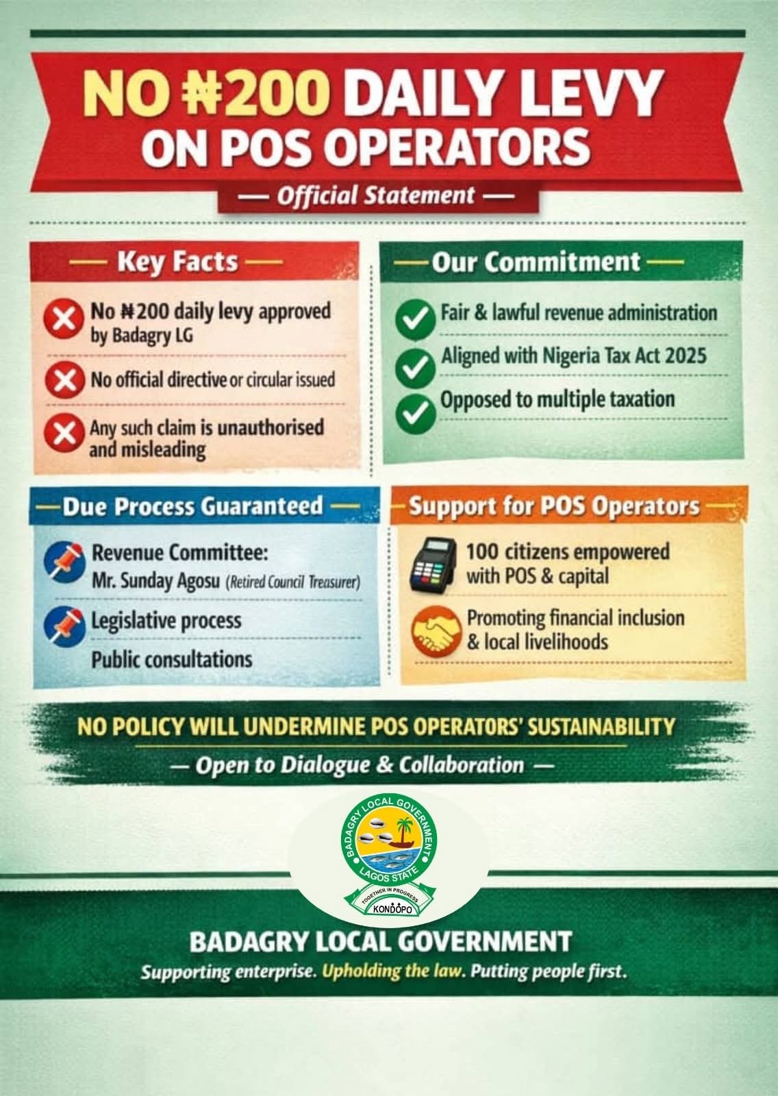 Badagry Local Government Denies ₦200 Daily Levy On POS Operators