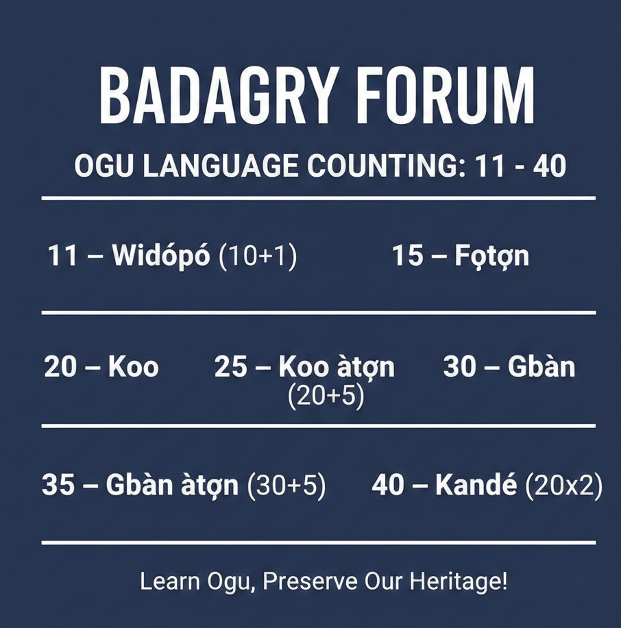 Following our previous lesson where we covered numbers 1–10 (badagryforum.com.ng/p/55/number-counting-in-ogu-language-1-10), we will now explore the next stage of our counting system.